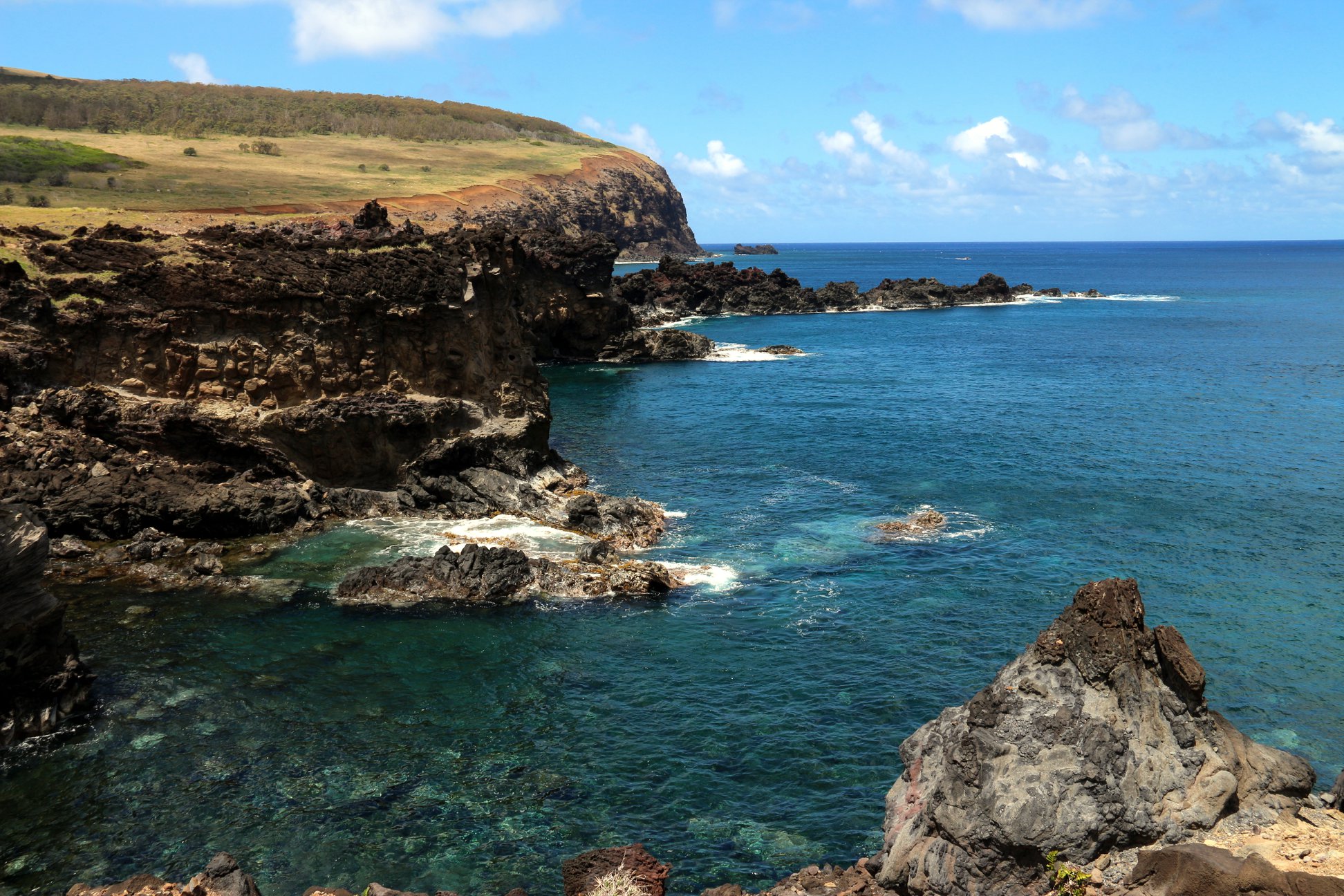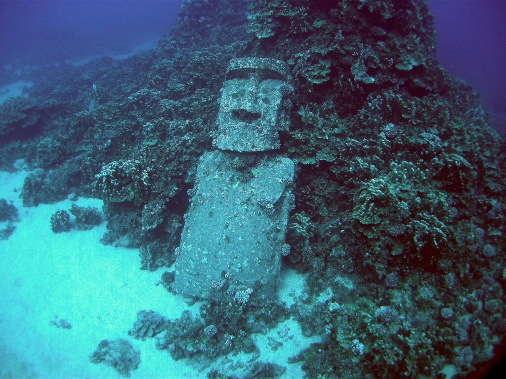 A imensidão do mar chama a atenção. Afinal, a Ilha de Páscoa se trata de uma das áreas habitada mais remota do mundo, a porção de terra que está isolada, quase 3700 quilômetros da costa Chilena. Possui a beleza de ter ao redor as águas limpas e cristalinas do Oceano Pacífico. Vale um mergulho para contemplar os segredos da ilha chilena. No fundo do mar, cerca de 20 metros, está o único Moai submerso do local. Vale dizer que não é um Moai verdadeiro, mas construído para ser atração turística. O curioso é a vida marinha, que pouco se manifesta ao longo do passeio pelas águas do límpido mar, pelo menos, quando do mergulho, foi a realidade que se apresentou.